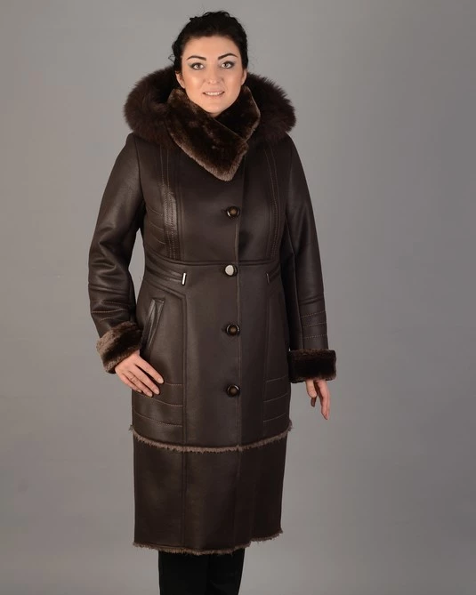Женская искусственная дубленка на пуговицах, капюшон - съемный, оторочен мехом песца натурального. Приталенный крой, длина изделия 110см, размерный ряд модели 50-62. В наличии цвета как на фото, а также темно-синяя, сливовая.
