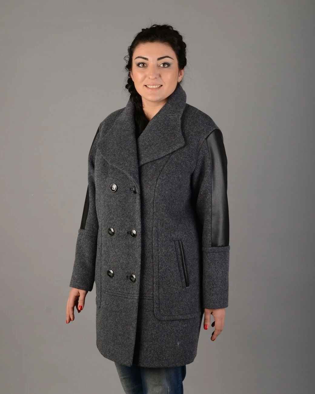Осенее шерстяное пальто (90% шерсти, 10% синтетики). Крой пиджака, свободный, на пуговицах, два прорезных кармана отделанных искусственной кожей. Воротник отложной, на рукавах деккор из искусственной кожи Длина изделия 85 см. Размерный ряд модели -44-54.