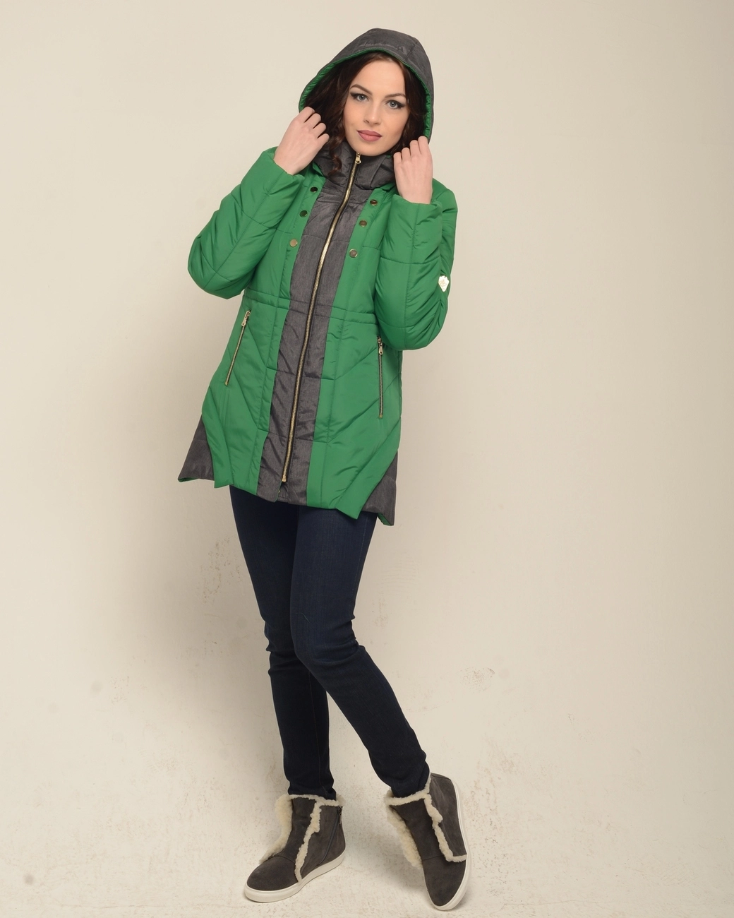 Молодежная зимняя куртка. Двухцветная. Утеплитель - синтепон зимний. Капюшон вшит, застежка - молния. Два прорезных кармана на молниях. Длина изделия - 75 см. Размерный ряд модели 44-50.