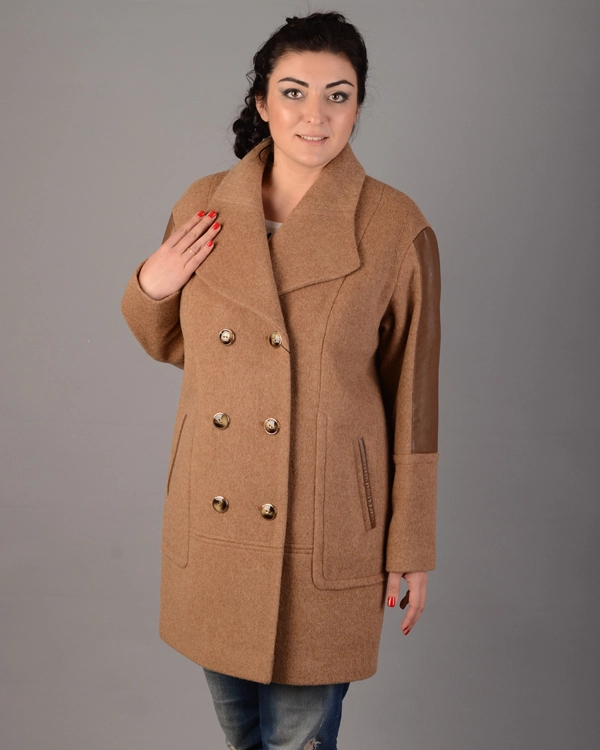 Осенее шерстяное пальто (90% шерсти, 10% синтетики). Крой пиджака, свободный, на пуговицах, два прорезных кармана отделанных искусственной кожей. Воротник отложной, на рукавах деккор из искусственной кожи Длина изделия 85 см. Размерный ряд модели -44-54.