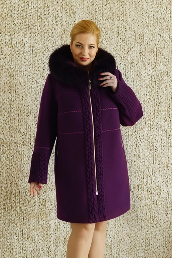 Зимнее пальто из кашемира. теплитель - синтеватин. Свободный крой, капюшон вшитый, оторочен натуральным мехом пеца крашенного в тон пальто. Пальто декорировано имитацией вязки по периметру застежки и на рукуавах, а также вышивкой. Застежка - молния. Два прорезных кармана. Длина изделия - 90 см. Размерный ряд модели - 46-58. Цвета в однотоне - фиолетовый, синий, черный. В двухцветном варианте - баклажан, оливковый, терракотовый.