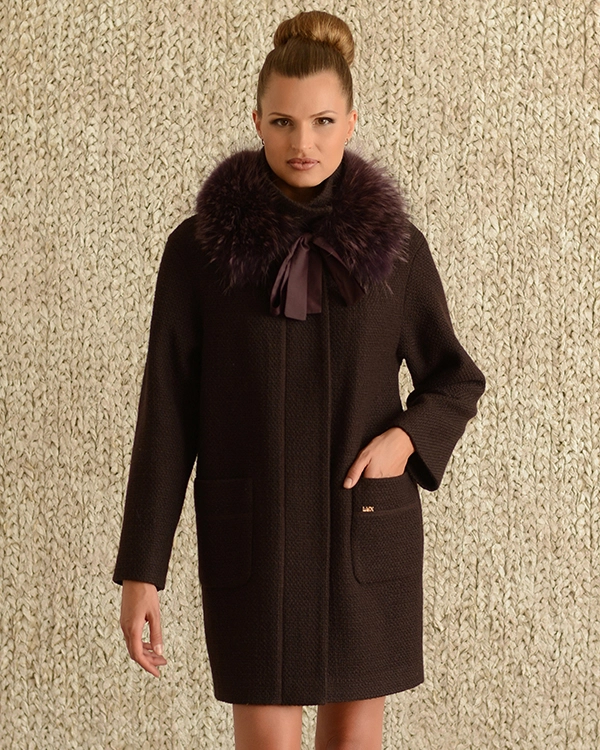 Зимнее полупальто. Крой свободный. Два накладных кармана. Застежка - потайные пуговицы. Воротник стойка, меховой ворот (мех енота) выполнен в виде хомута, завязывающегося на шелковые ленточки - съемный. Материал изделия - итальянская шерсть, материал имеет структуру плетения. Состав 90% шерсти, 30% синтетики. Утеплитель синтеватин. Размерный ряд модели 44-50. Цвета в наличии шоколад, черный и бело-серый.