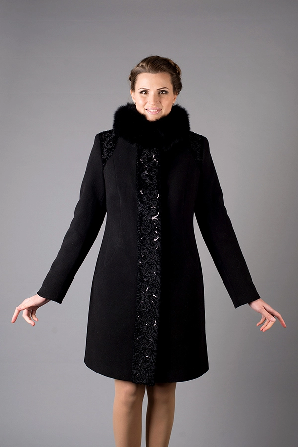 Зимнее пальто с оторочкой, по всей длине затежки, из меха искусственого каракуля с паетками. Ворот стойка, со съемным мехом натурального крашенного втон пальто песца. В наличии черный и белый цвета. дЛина изделия - 95 см. Два прорезных кармана, подкладка - акрил, застежка - пуговицы. Размерный ряд модели - 42-52.