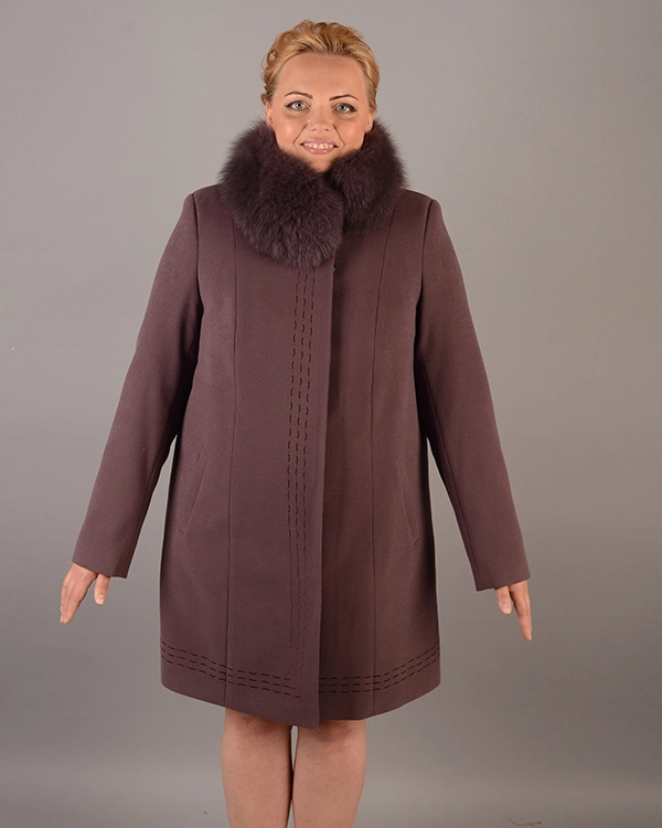 Зимнее пальто женское, ворот стойка, отороченный съемным мехом натурального песца, крашенного в цвет пальто. Пальто трапеция. По ркаю застежки и по низу пальто вышивка пнктир в тон пальто. Хорошо подходит для женщин с пышными формами, скрывает все недотстки фигуры. Длина изделия - 90см. Размерный ряд модели 48-60. Неприталенное. Цвета в наличии - терракот, васильковый, черный, слива